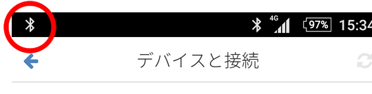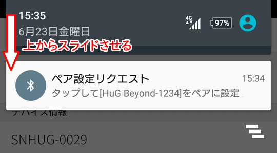 接続処理中に、画面左上にBluetoothのマークが出てきたら、指で画面上から下に向かってなぞるようにし、通知バーを表示します