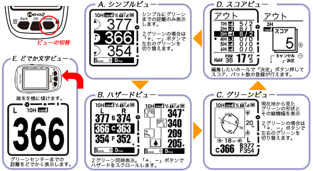 本製品には多彩なナビ画面のビューがあり、各ビューの切り替えは「Mode」ボタンを押すだけ!。シンプルビューではグリーンのフロント、センター、バックを同時に表示。ハザードビューではグリーンに加えてコース内の各ハザードまでの距離をアイコンをセットで表示。グリーンビューでは現在地点からみたグリーンの形状とその縦横幅を表示します。端末を横にすれば大きな文字でグリーンセンターまでの距離を「どでか」く表示するどでか文字ビュー、スコアビューも搭載